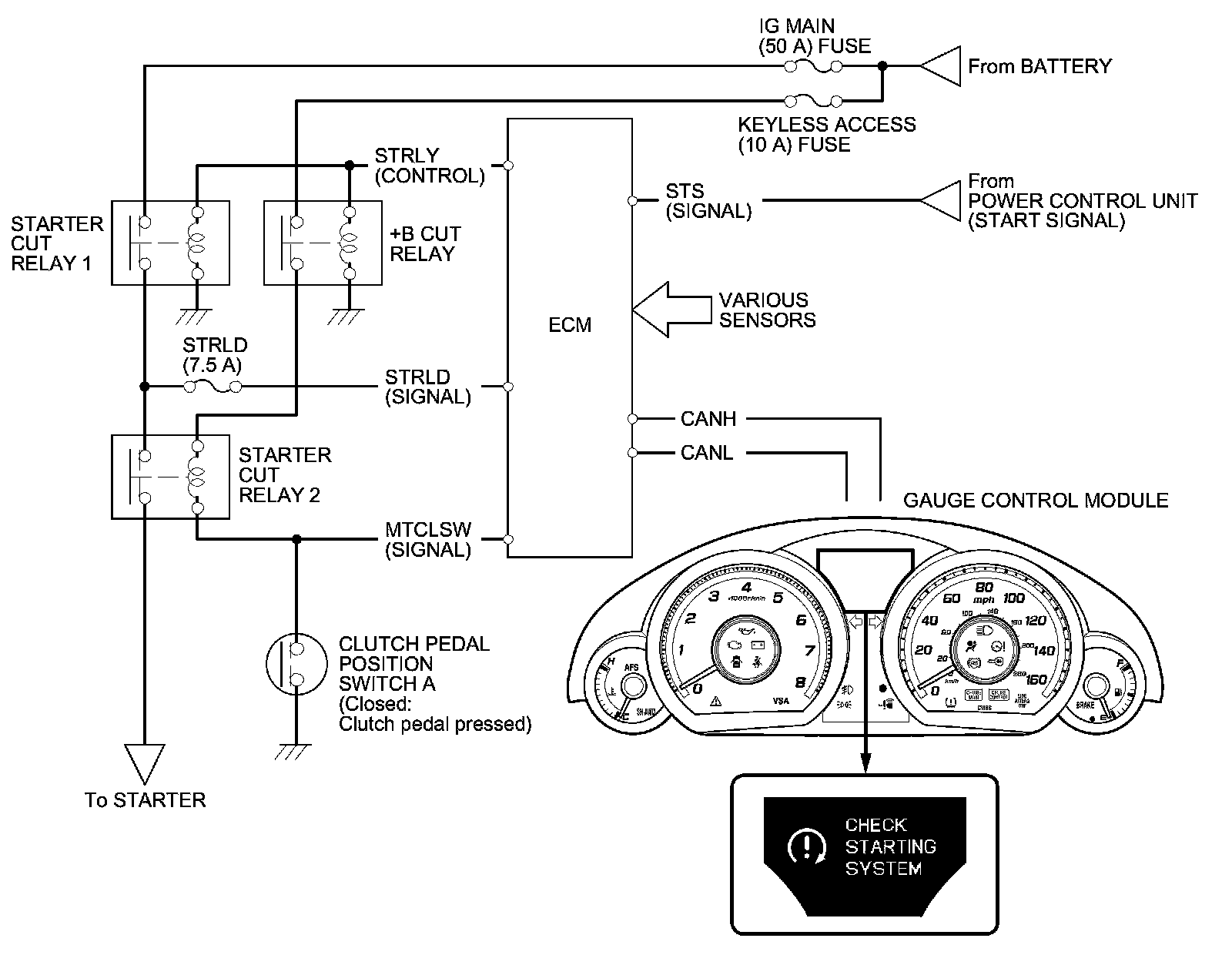 - When the engine start/stop button pressed to select the START mode, the ECM applies current to starter cut relay 1 and starter cut relay 2, and the +B cut relay is turned on. Then battery voltage is applied to the starter solenoid, and starter motor runs.