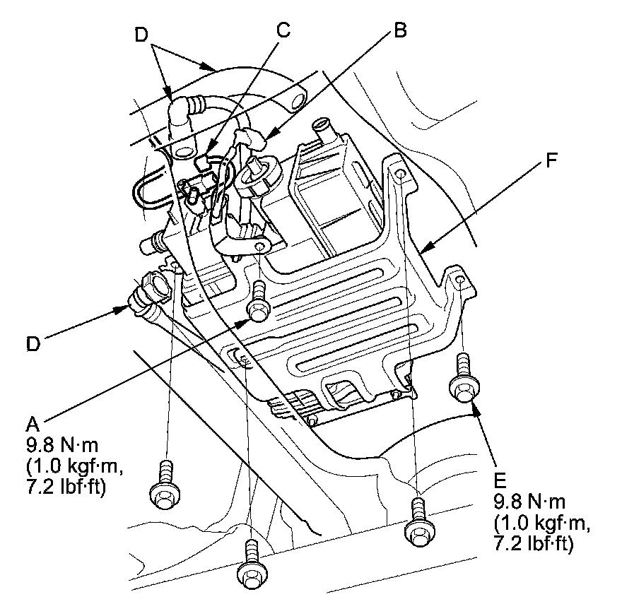 2. Remove the bolts (E), and move the EVAP canister assembly (F) to the rear.