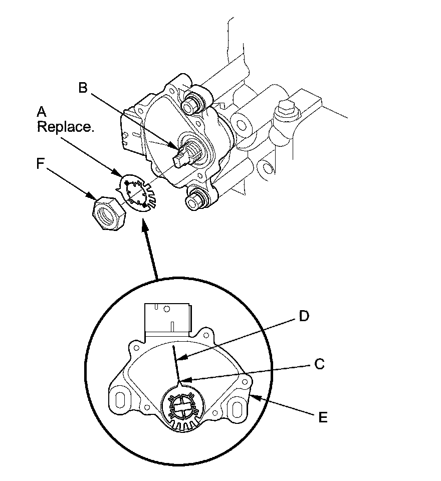 14. Install a new lock washer (A) over the selector control shaft (B) by aligning the indicator tab (C) of the lock washer with the N positioning line (D) on the transmission range switch (E), and install the locknut (F).