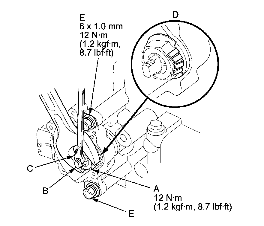 15. Push the locknut against the transmission housing to seat the transmission range switch into the selector control shaft, and tighten the locknut (A) to 12 Nm (1.2 kg-m, 8.7 lb-ft) while holding the selector control shaft (B) with a 6.0 mm wrench (C), then bend the lock tabs (D) of the lock washer against the locknut.