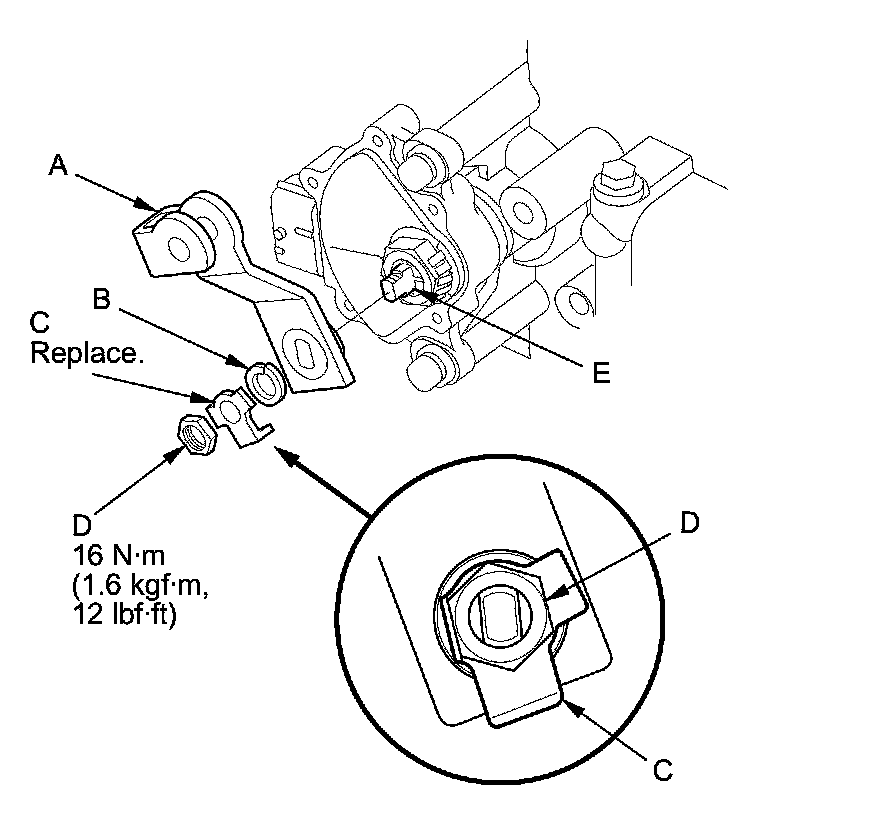 17. Install the control lever (A), the spring washer (B), a new lock washer (C), and the locknut (D) on the selector control shaft (E). Bend the lock tab of the lock washer against the locknut.