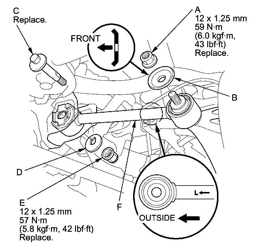 - First install all of the components, and lightly tighten the bolts and the nuts, then raise the suspension to load it with the vehicle's weight before fully tightening to the specified torque.