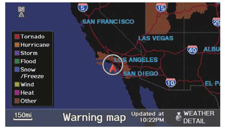 XM Radio now offers XM weather and radar that shows current local weather as weather icons on the map screen. These are different from weather related traffic incident icons. The weather icons are: