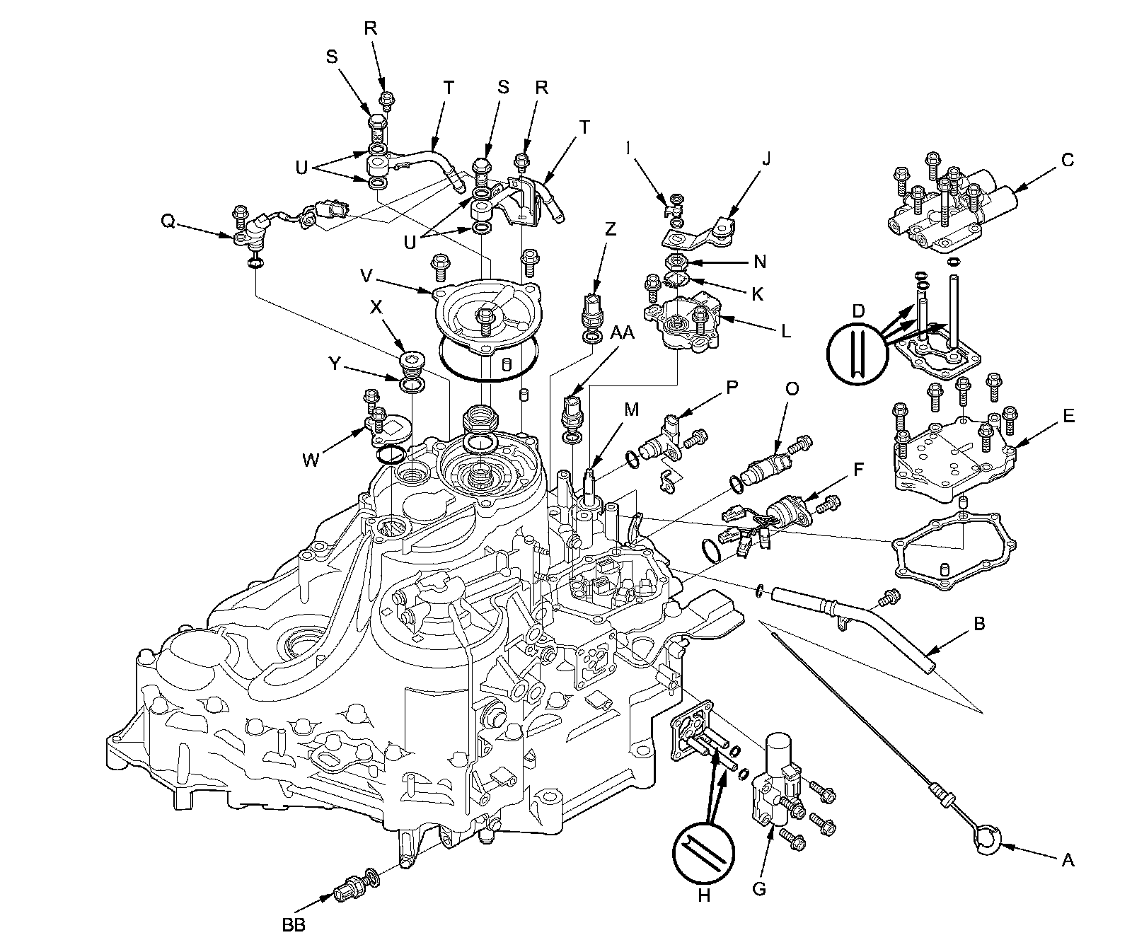 2. Remove A/T clutch pressure control solenoid valves A and B (C) (six bolts), the ATF feed pipes (D) (three), the O-rings (three), and the gasket.