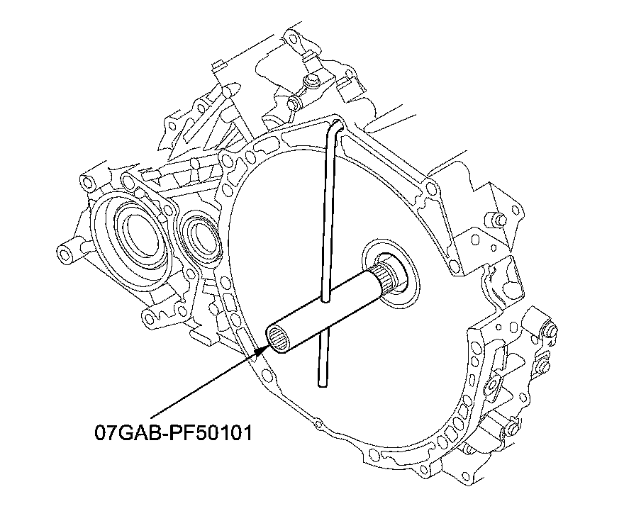 22. Release the snap ring pliers, and remove the transmission housing (E), the two dowel pins (F), and the gasket.