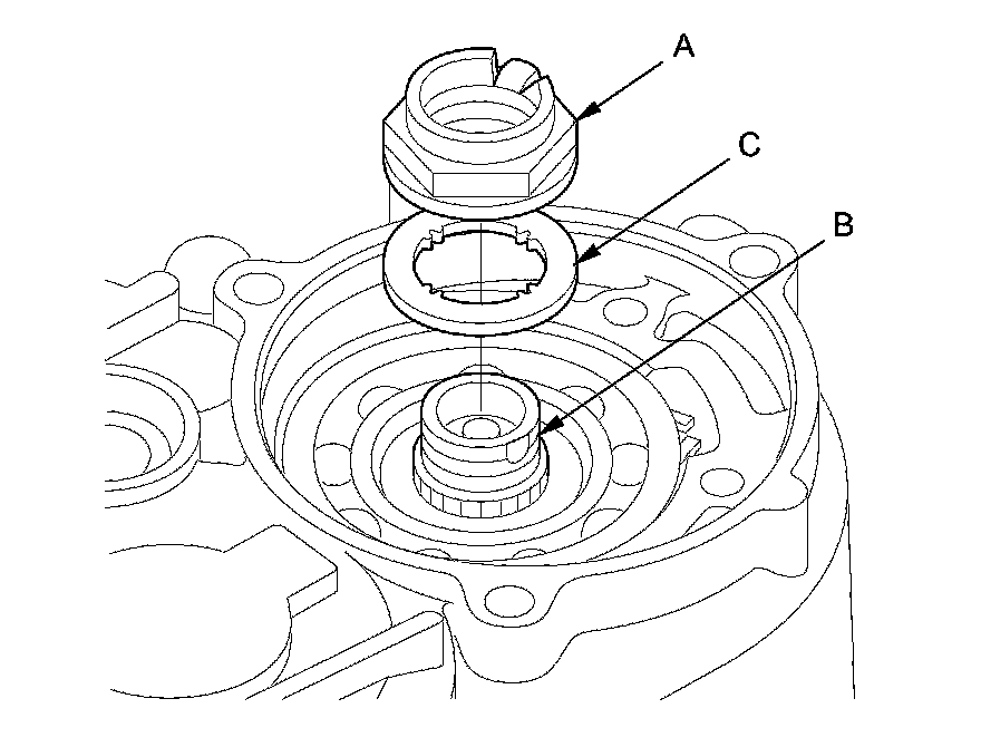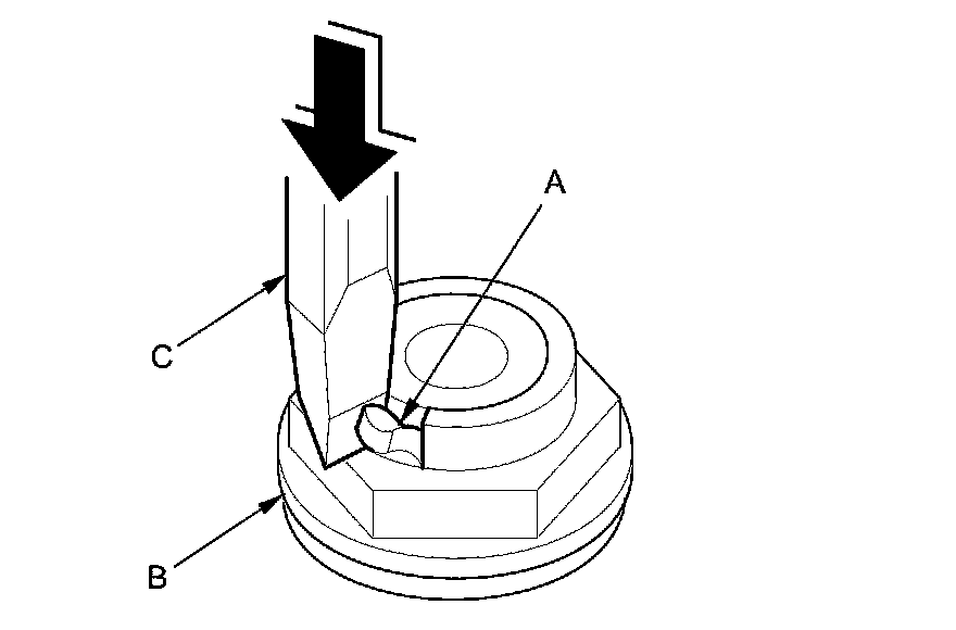 17. Cut the lock tab (A) off the mainshaft locknut (B) using a chisel (C).