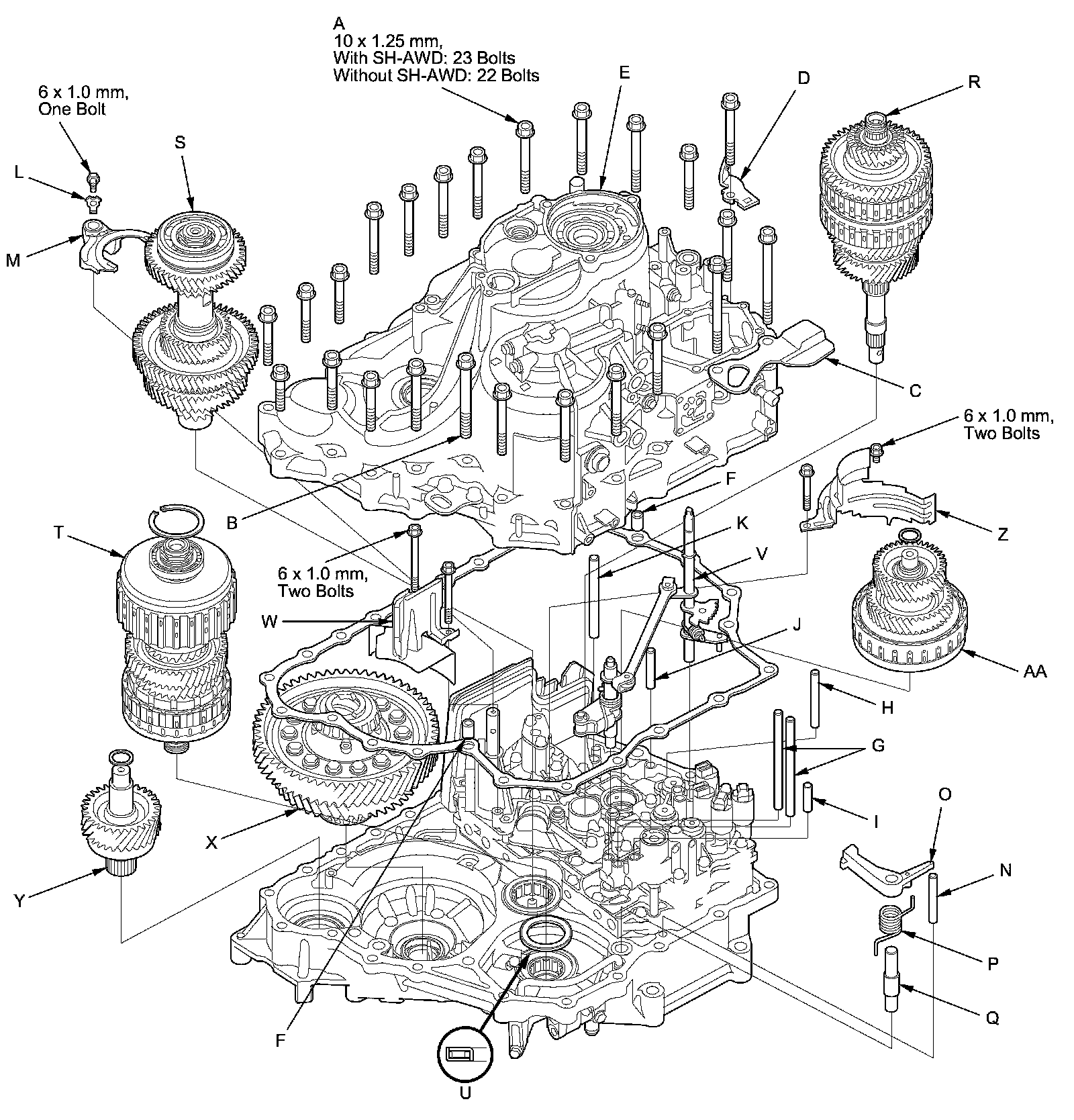 20. Remove the transmission housing mounting bolts (A) (with SH-AWD: 23 bolts, without SH-AWD: 22 bolts), 12 x 1.25 mm bolt (B), transmission hanger (C), and ground terminal bracket (D).