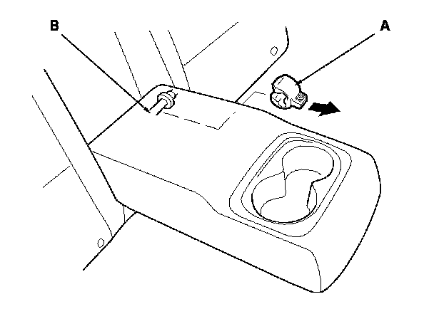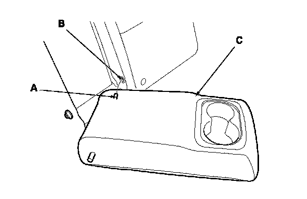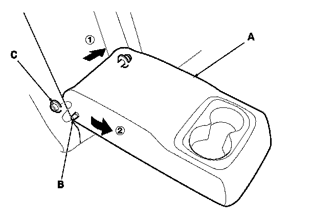 5. Slide the armrest (A) toward the driver's side, and remove the pivot shaft (B) from the collar (C).