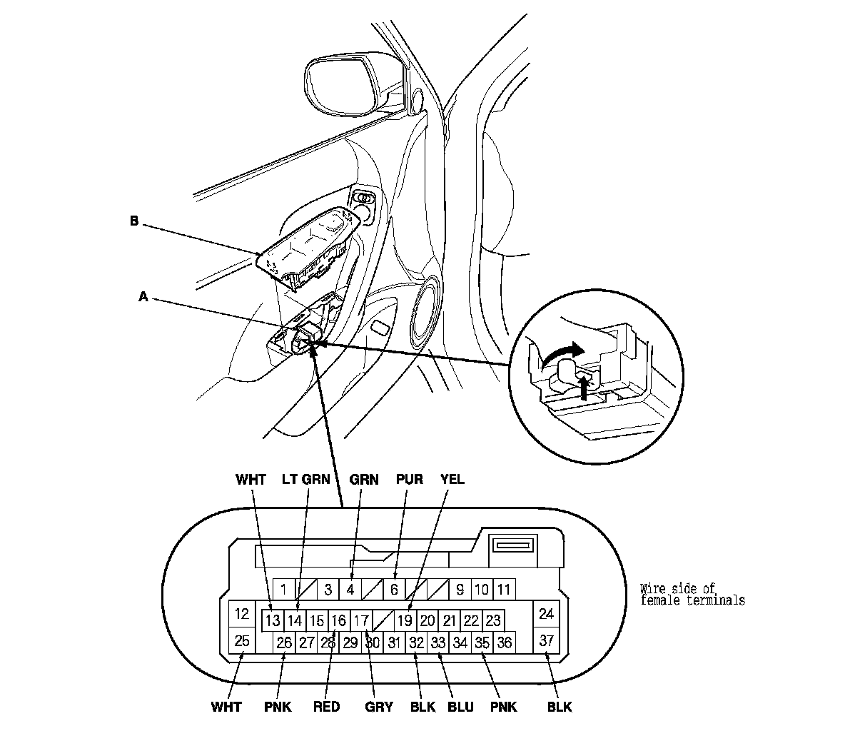 3. Disconnect the 37P connector (A) from the power window master switch (B).