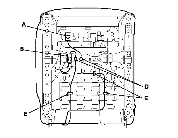 - Before installing the seat-back cover, make sure airbag attachment wires A, B, and C are installed in the reinforcing cloths (D) correctly, and that wire A and wire C are securely assembled.