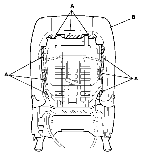 16. Remove the seat-back cover/pad (A) from the seat-back frame (B).