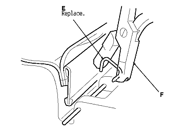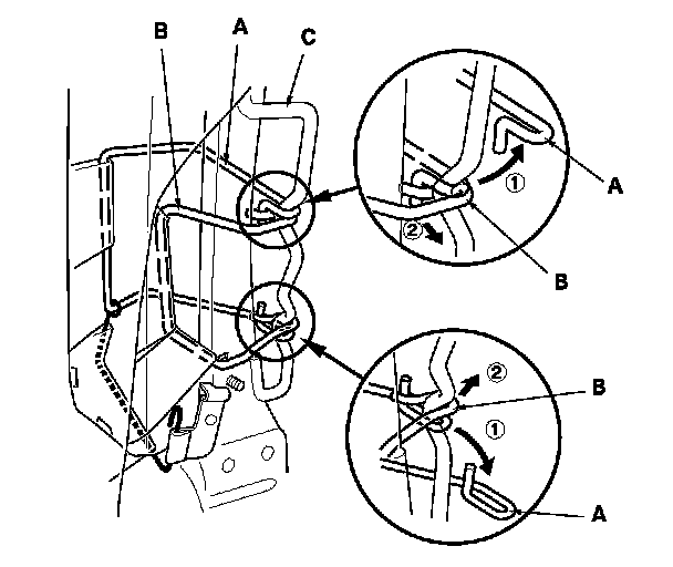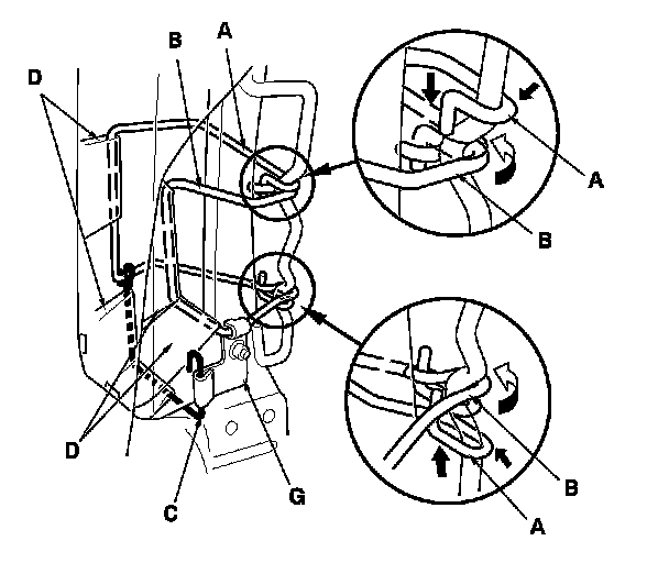 - Reinstall airbag attachment wires A, B, and the bracket (G) of airbag attachment wire C to the seat-back frame as shown.