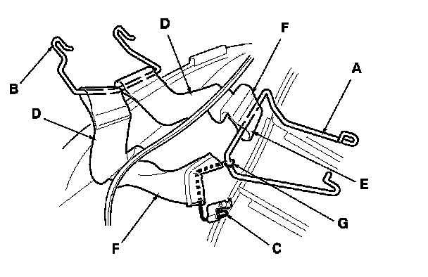 18. Remove airbag attachment wire B from the outside reinforcing cloths (D). Pull airbag attachment wire A out through the loops (E) of the inside reinforcing cloths (F) and through loop (G) of airbag attachment wire C. Remove airbag attachment wires A and C.