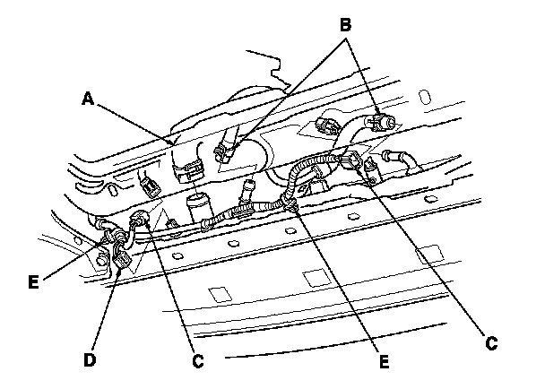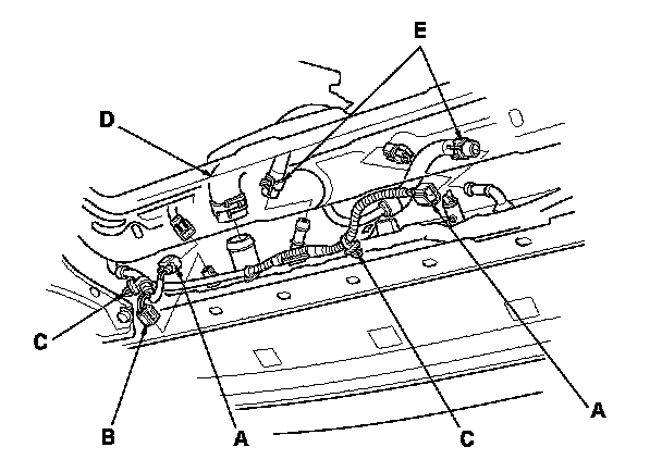 6. Disconnect the fan motor connectors (C) and engine coolant temperature (ECT) sensor 2 connector (D), then remove the harness clamps (E).