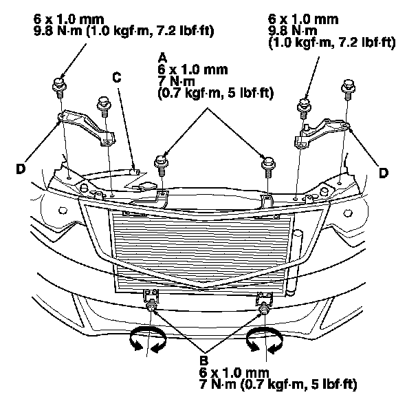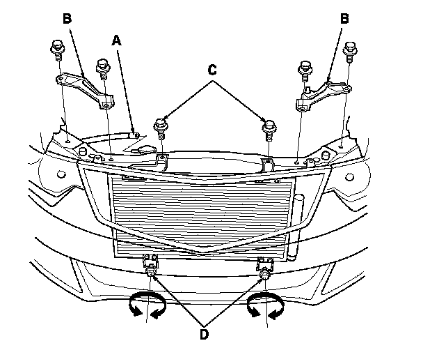 12. Remove the A/C condenser upper mounting bolts (C) and loosen the A/C condenser lower mounting bolts (D).