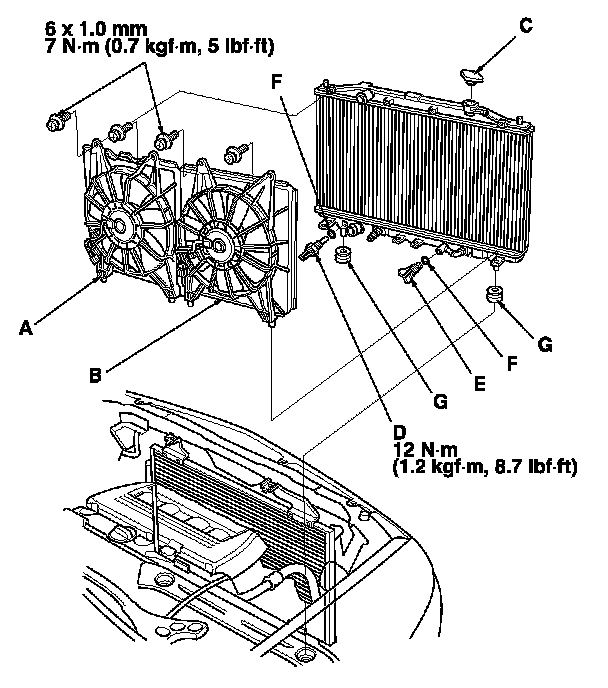 14. Reassemble the radiator with new O-rings (F).