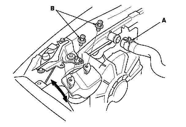 11. Disconnect the coolant reservoir hose (A) and remove the radiator upper brackets (B).