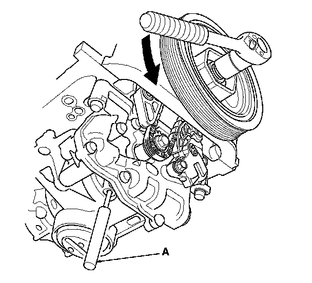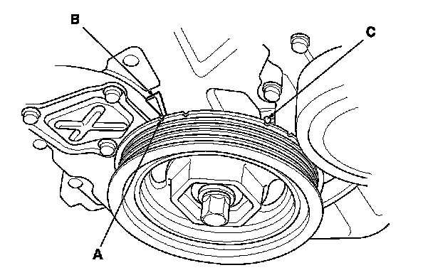1. Turn the crankshaft pulley so its top dead center (TDC) mark (A) lines up with the pointer (B).