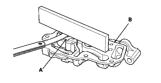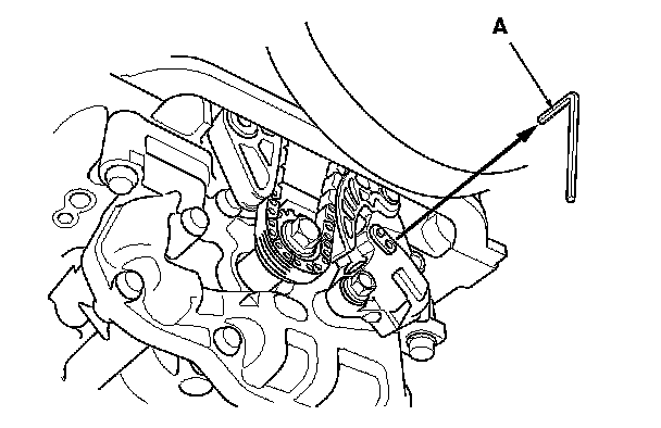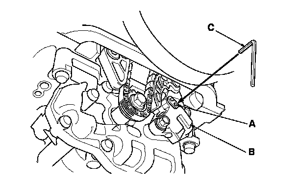 5. Align the holes on the lock (A) and the oil pump chain auto-tensioner (B), then insert a 3.0 mm (0.12 in) diameter pin (C) into the holes. Turn the crankshaft clockwise to secure the pin.