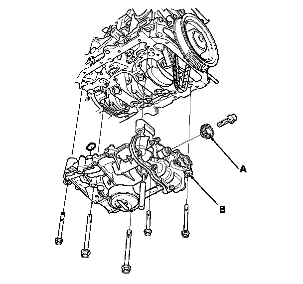 8. Remove the oil pump sprocket (A), then remove the oil pump (B).