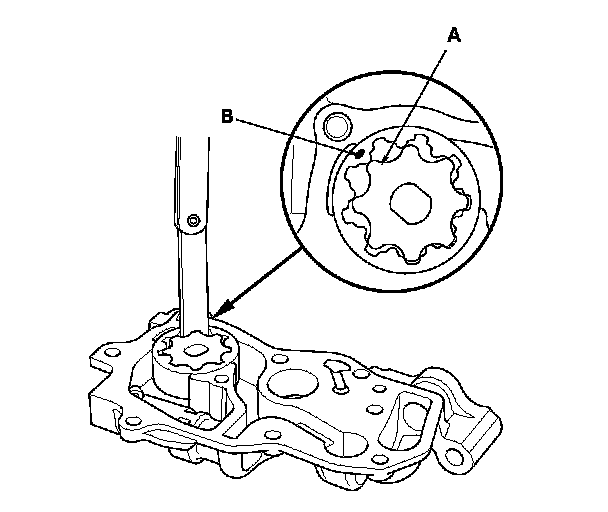 2. Align the tip of the inner rotor tooth (A) with the mark (B) on the outer rotor, then check the inner-to-outer rotor radial clearance between the inner rotor and the outer rotor. If the inner-to-outer rotor radial clearance exceeds the service limit, replace the oil pump.