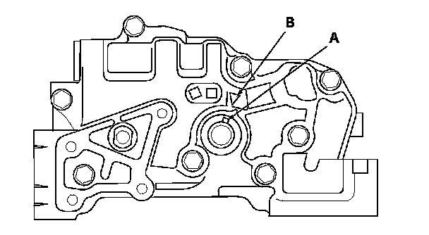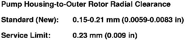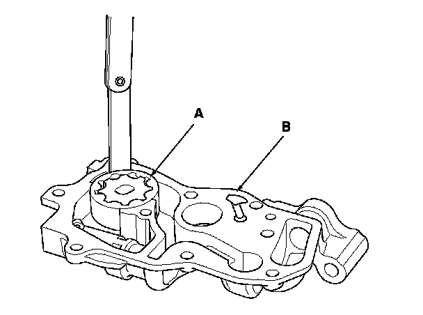 4. Check the pump housing-to-outer rotor radial clearance between the outer rotor (A) and the pump housing (B). If the pump housing-to-outer rotor radial clearance exceeds the service limit, replace the oil pump.