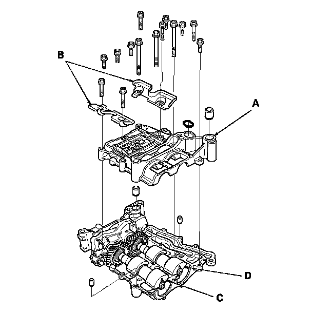 4. Remove the upper balancer shaft holder (with bearings) (A) and baffle plates (B), then remove the front balancer shaft (C) and the rear balancer shaft (D).