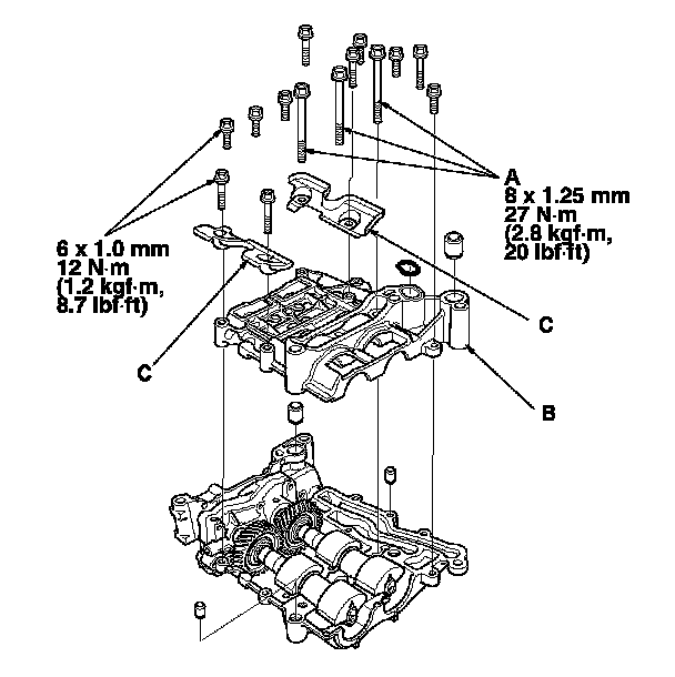 13. Install the upper balancer shaft holder (B) and the baffle plates (C).