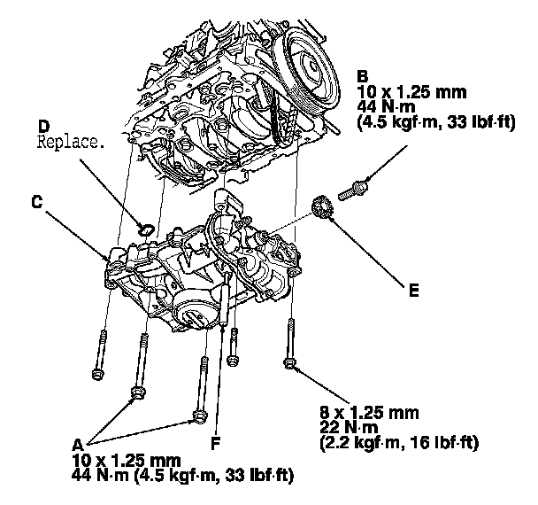 4. Apply new engine oil to the threads of the oil pump mounting bolts (A) and oil pump sprocket mounting bolt (B), then loosely install the oil pump (C) with a new O-ring (D), then install the oil pump sprocket (E).