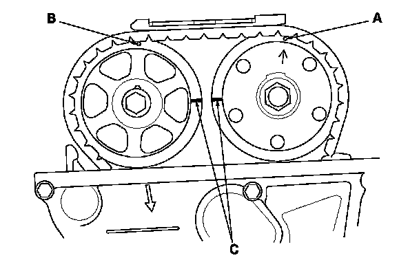 6. Set the No. 1 piston at top dead center (TDC). The punch mark (A) on the variable valve timing control (VTC) actuator and the punch mark (B) on the exhaust camshaft sprocket should be at the top. Align the TDC marks (C) on the VTC actuator and the exhaust camshaft sprocket.