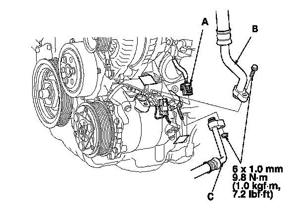 5. Disconnect the A/C compressor clutch connector (A). Remove the bolts and the nut, then disconnect the suction hose (B) and the discharge hose (C) from the A/C compressor. Plug or cap the lines immediately after disconnecting them to avoid moisture and dust contamination.