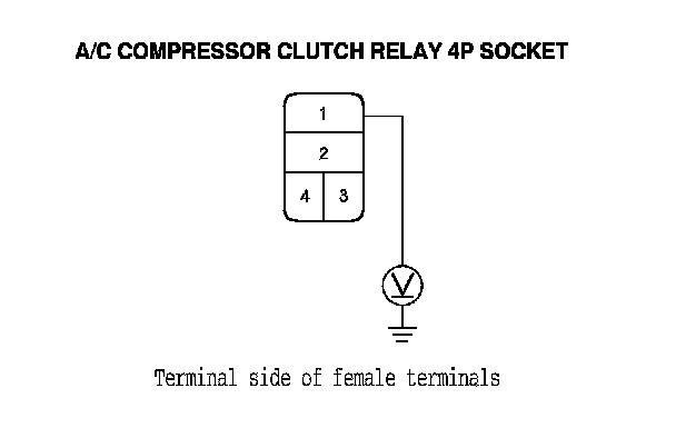 8. Measure the voltage between the A/C compressor clutch relay 4P socket terminal No. 1 and body ground.