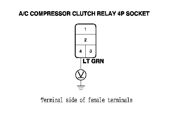12. Measure the voltage between the A/C compressor clutch relay 4P socket terminal No. 4 and body ground.