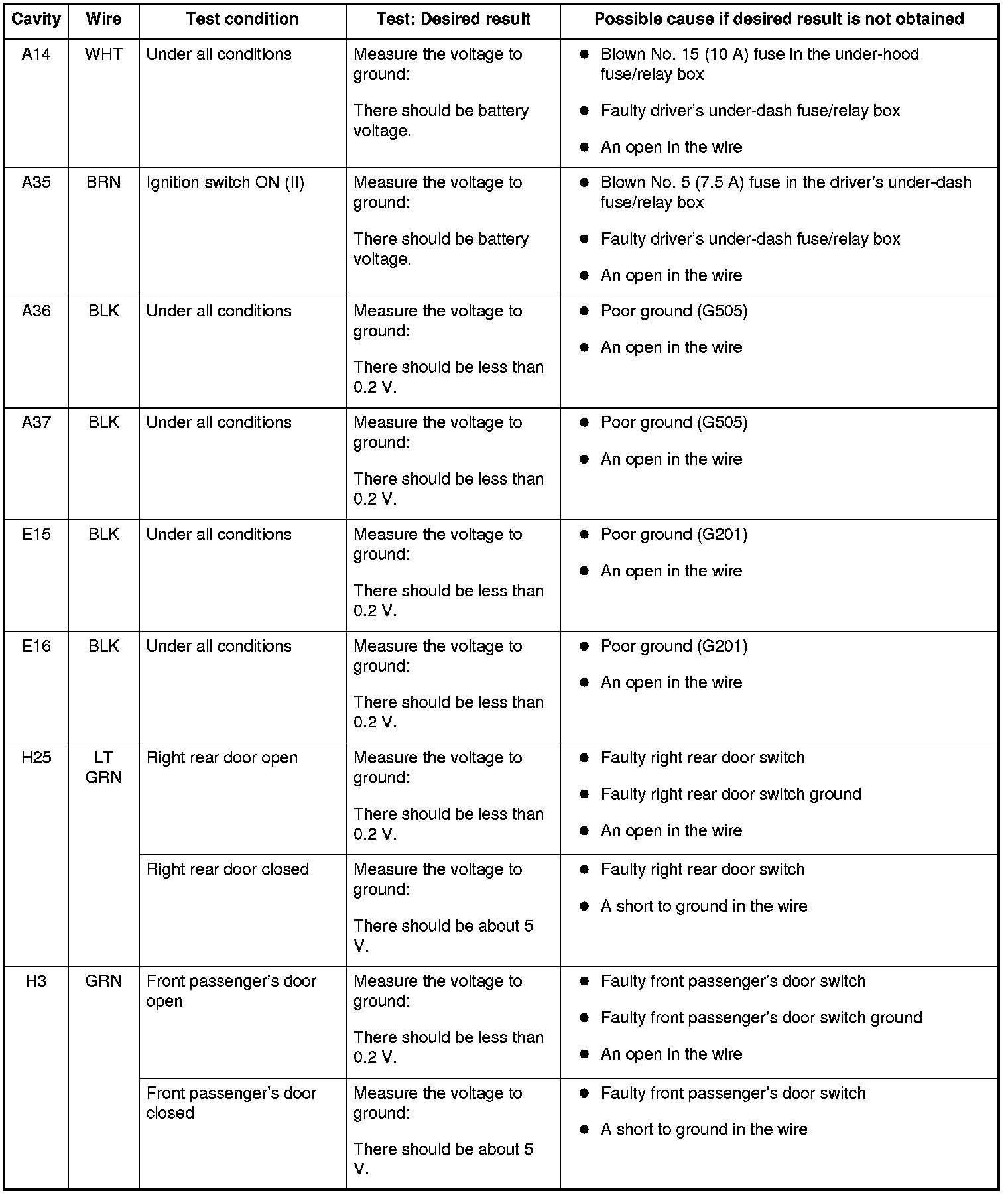 5. Reconnect the connectors to the driver's under-dash fuse/relay box, and do these input tests at the following connectors.