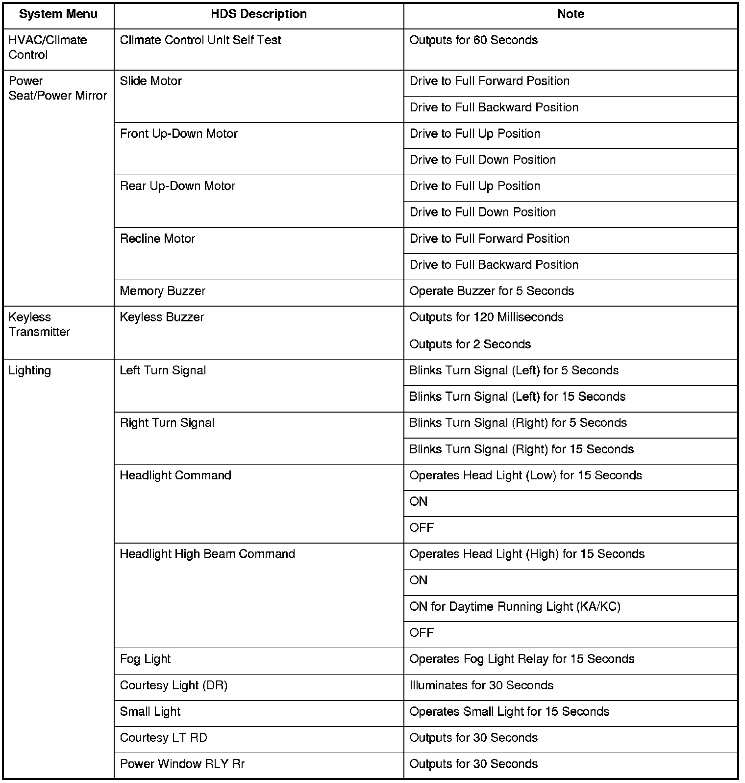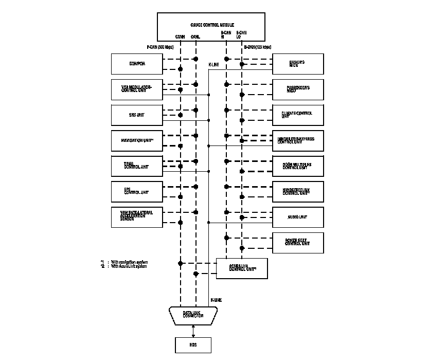 By connecting the HDS to the data link connector (DLC), the HDS can retrieve the diagnostic information from the driver's MICU via a diagnostic line called the K-LINE. The K-LINE is a separate communication line from the CAN lines, but it is connected to most of the CAN related ECUs. The driver's MICU is a gateway between the HDS and B-CAN related ECUs, and sends B-CAN diagnostic information to the HDS. When doing a function test with the HDS, the HDS sends an output signal through the K-LINE to the driver's MICU. The driver's MICU either relays the request to another ECU, or commands the function its self.