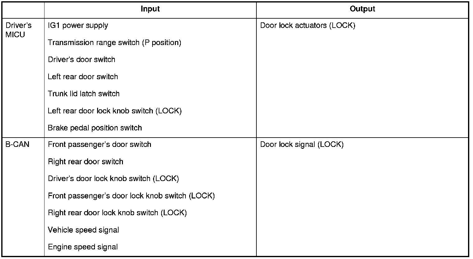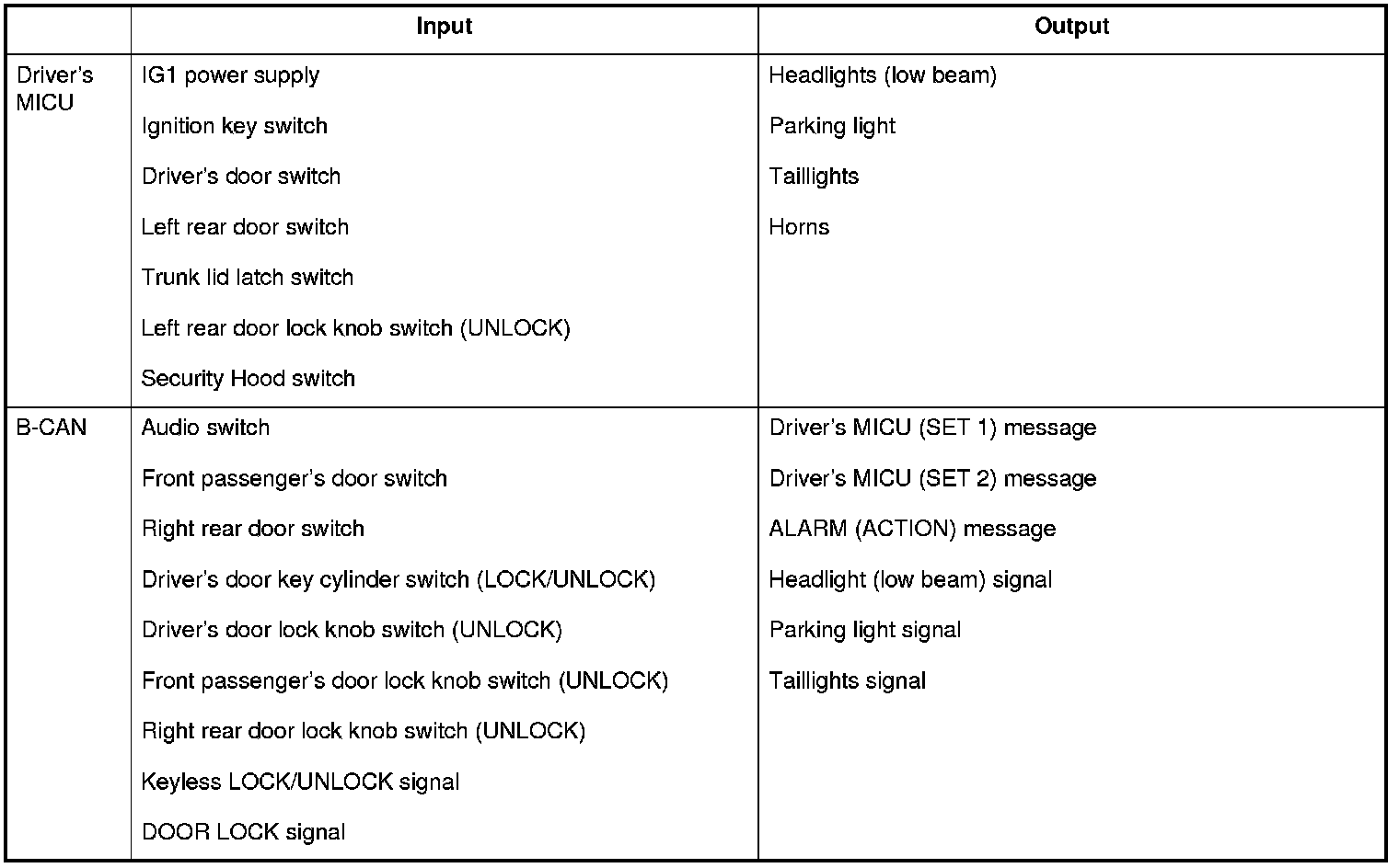 The driver's MICU control of the door lock actuators LOCK, UNLOCK, DRIVER'S UNLOCK, TRUNK UNLOCK is based on the B-CAN door lock switch signals.