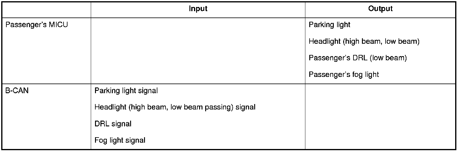 The passenger's MICU control of the front passenger's side headlight, and parking lights is based on inputs from the driver's MICU.