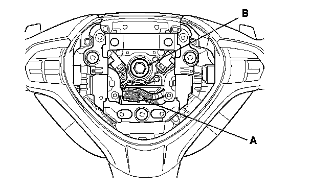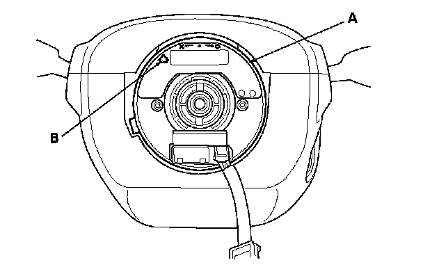 6. Before installing the steering wheel, make sure the front wheels are pointing ahead, then center the cable reel (A). Do this by first rotating the cable reel clockwise until it stops. Then rotate it counterclockwise (about three turns) until the arrow mark (B) on the cable reel label points straight up.