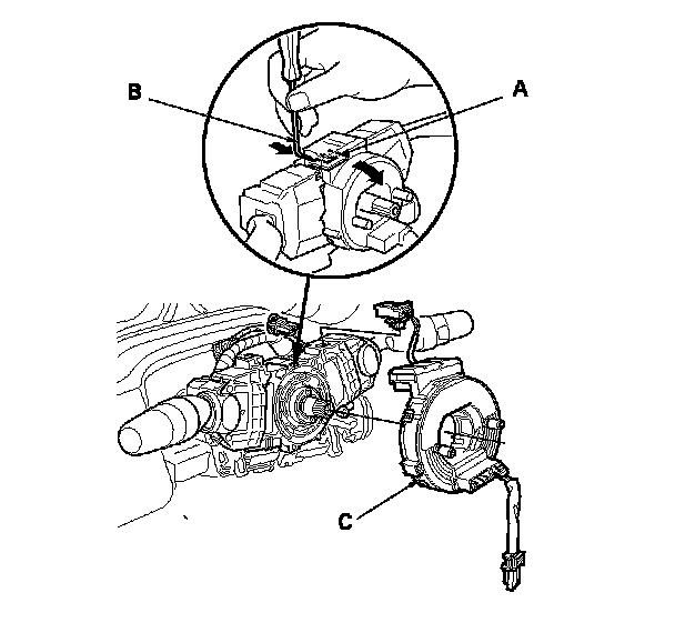 8. Release the lock tab (A) under the cable reel connector with a 90 ° hook shaped tool (B). Slide the tool below the cable reel connector just above the lock tab. Release the lower lock tab (C), and slide the cable reel off the column.