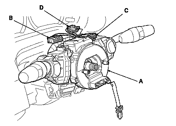 7. Disconnect the dashboard wire harness 4P connector (A) from the cable reel 4P connector (B), then disconnect the dashboard wire harness 20P connector (C) from the cable reel (D).
