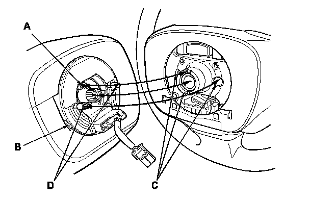 7. Position the two tabs (A) of the turn signal canceling sleeve (B) as shown, and install the steering wheel on to the steering column shaft, making sure the steering wheel hub (C) engages the pins (D) of the cable reel and tabs of the turn signal canceling sleeve. Do not tap on the steering wheel or steering column shaft when installing the steering wheel.
