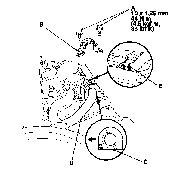 NOTE: During installation, align the paint marks (E) on the stabilizer bar with the side of the bushings.