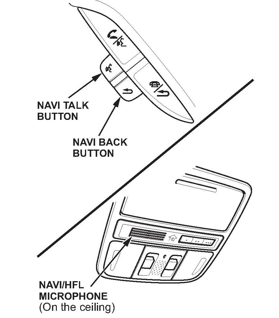 Voice recognition is controlled by the NAVI TALK and BACK buttons on the steering wheel. This is the primary way to give commands to the system. Using the navigation system buttons and interface dial allows the passenger to operate the system and should be considered a secondary method for the driver.NAVI TALK - Press and release this button to activate the voice control system. After pressing and releasing NAVI TALK, wait for the beep, then speak the command.