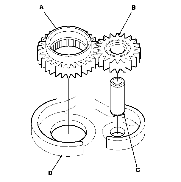 1. Install the ATF pump drive gear (A), the driven gear (B), and the ATF pump driven gear shaft (C) in the main valve body (D). Lubricate all parts with ATF, and install the ATF pump driven gear with its grooved and chamfered side facing up.