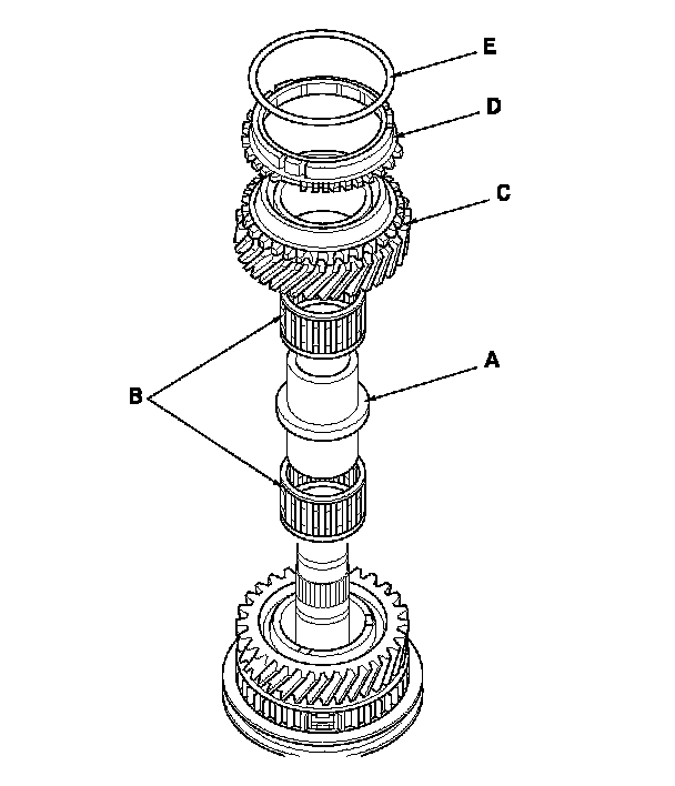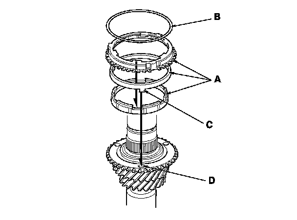 3. Install the double cone synchro assembly (A) with the synchro spring (B) by aligning the synchro cone fingers (C) with the holes (D) in 3rd gear.