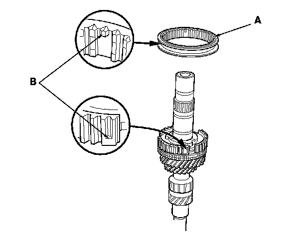 13. Install the 5th/6th synchro sleeve (A) by aligning the slots of the 5th/6th synchro sleeve and the 5th/6th synchro hub (B). After installing, check the operation of the 5th/6th synchro hub set.