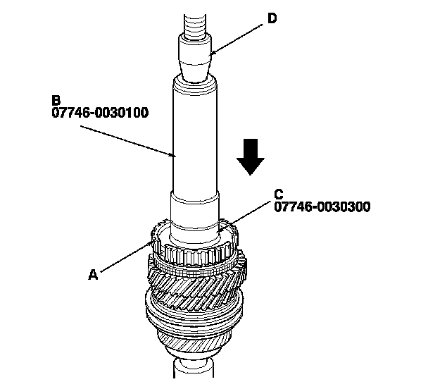12. Press on the 5th/6th synchro hub (A) using the 40 mm inner driver handle (B), the 30 mm inner bearing driver attachment (C), and a press (D).