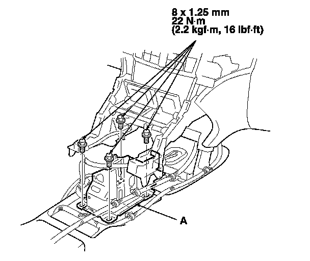 7. Remove the bolts, then remove the shift lever mount bracket (A).