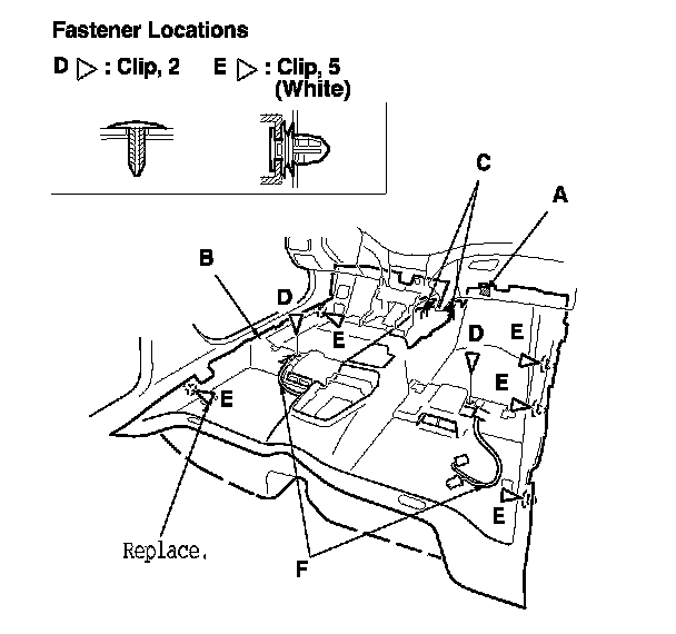 - Replace the clips fastening the carpet to both door sill areas with new ones.