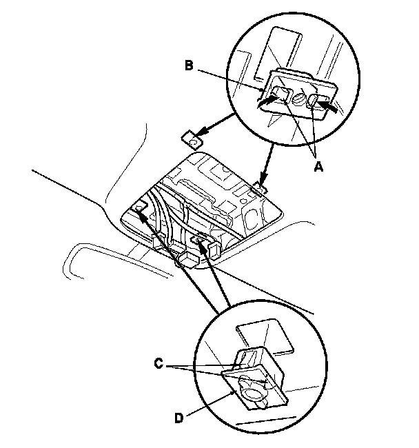 9. If necessary, detach the hooks (C) by prying out the map light clip (D), then remove the clip.